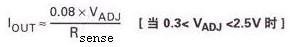 調節針可通過外置的直流電壓(VADJ)進行過驅動,以獲得超過內置的電壓基準,并調整輸出電流使其超出或低于額定值。此時的額定輸出電流為:
